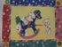 Rocking Horse playing with other Teddy Bears. Done in bright,bold Primary Colors. There is a 5" Border with pictures of Buttons against a Dark Blue, Red, Green and Pink background.